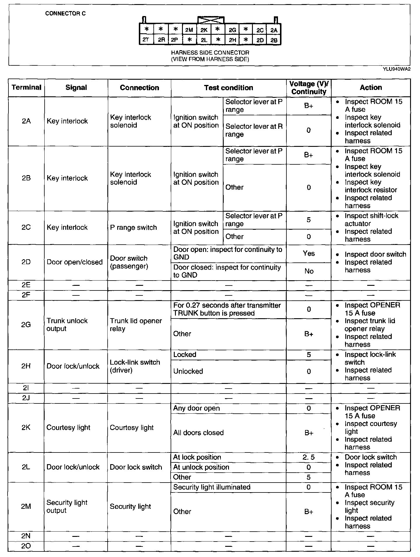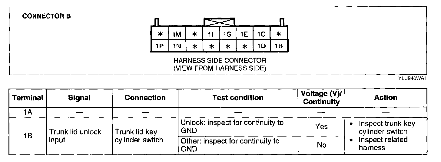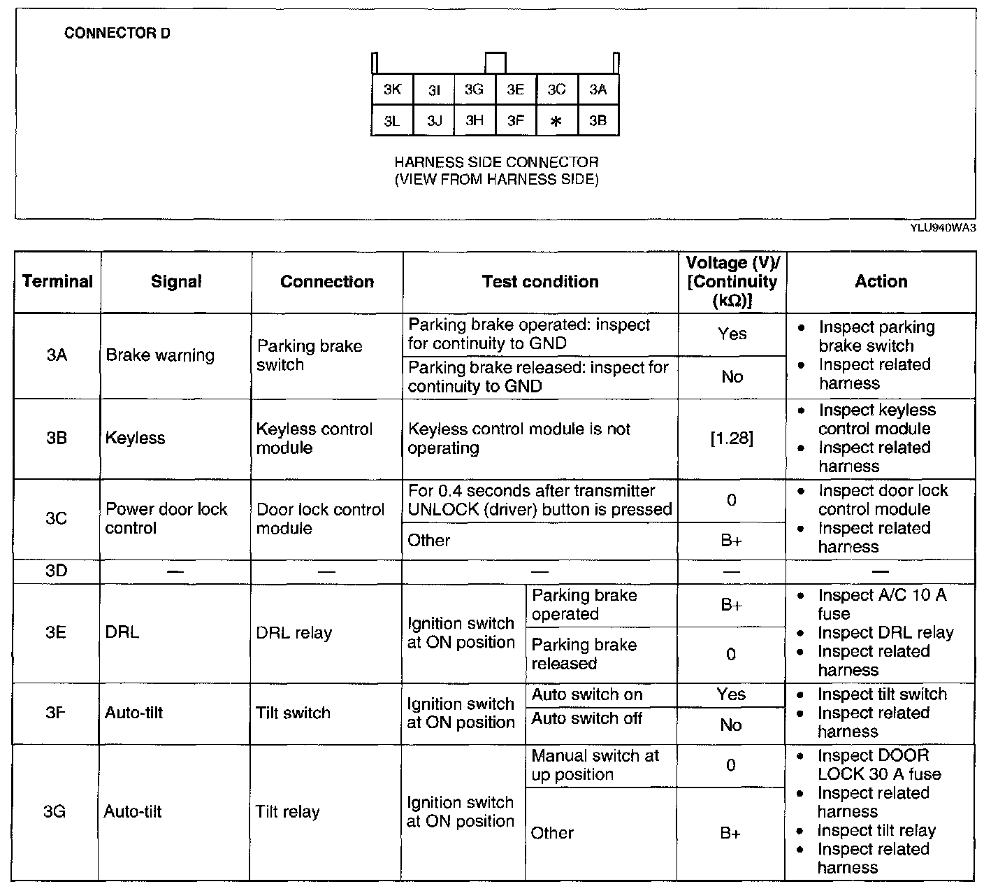- When measuring the voltage at terminal 3B of connector D, use a voltmeter with sufficiently high input impedance (1 mega ohm or more).
