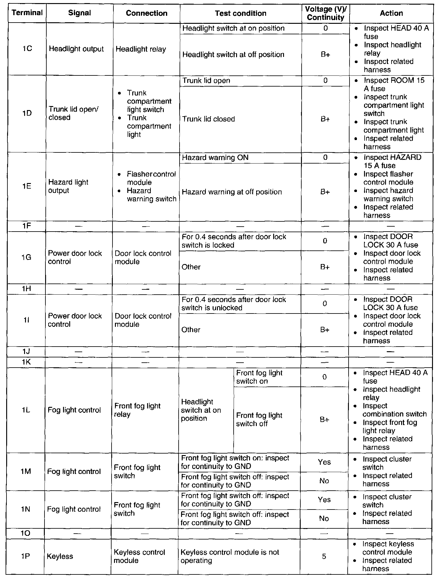 Connector B, C, and D (Terminals except 1B, 1M, 1N, 2D, 2T, 3A, 3F, 3H, 3J, and 3K)