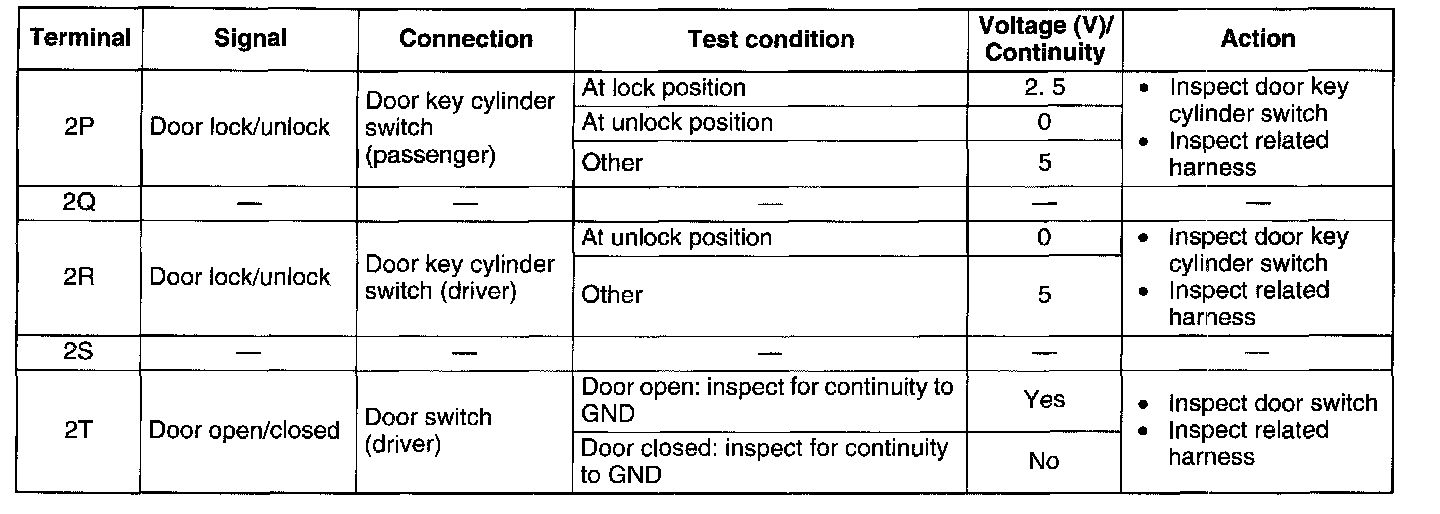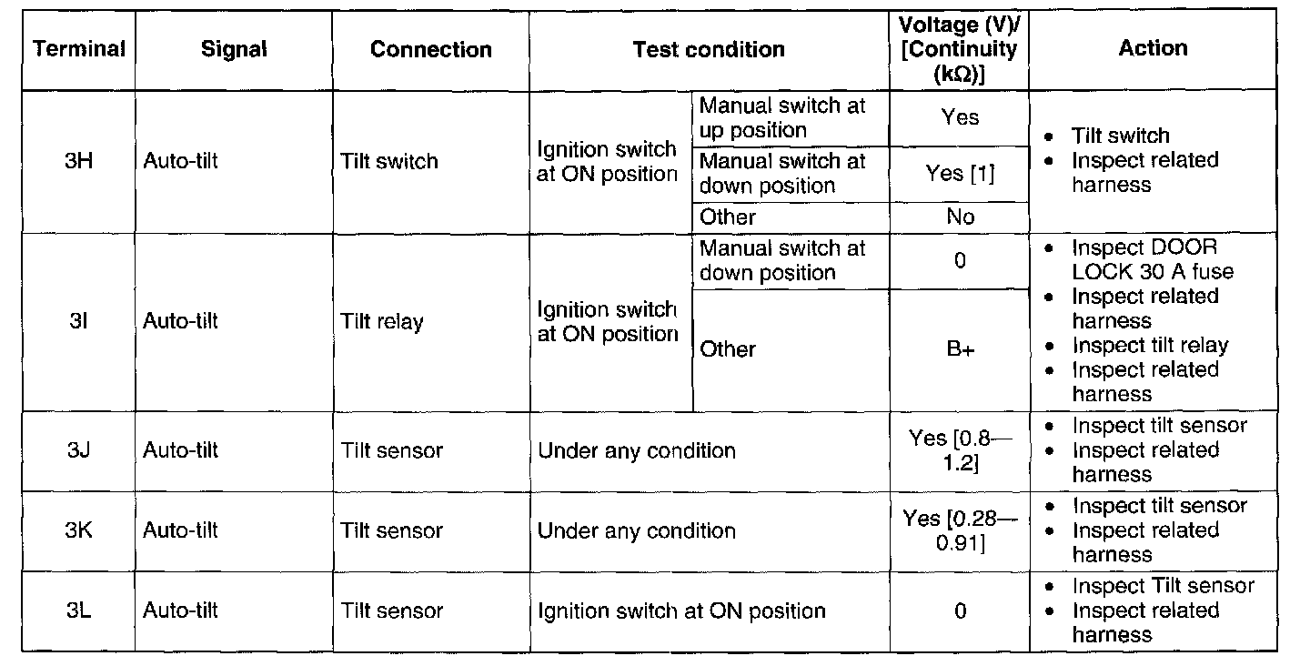 - If not as specified, inspect the parts listed under "Inspection area" and the related wiring harnesses.