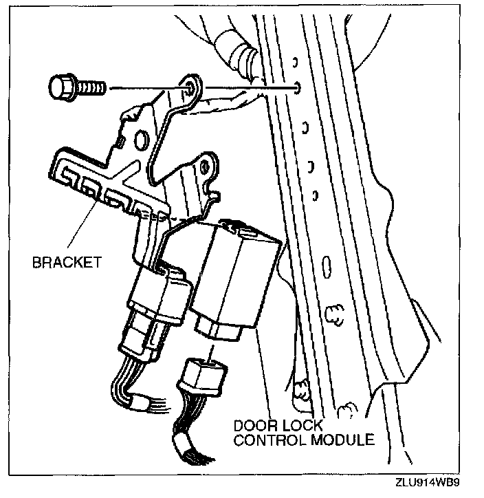 DOOR LOCK CONTROL MODULE REMOVAL/INSTALLATIONNOTE: Because the lock section of the relay is damaged easily, do not remove the module from the bracket unless replacement is necessary. Always perform an inspection of the module before removal.