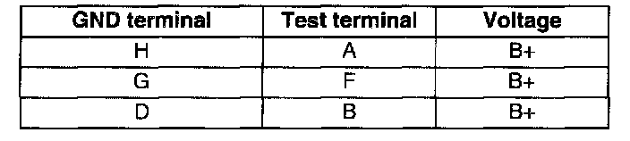 4. Measure the voltage at the terminals of the door lock control module connector with the following terminals connected to GND.