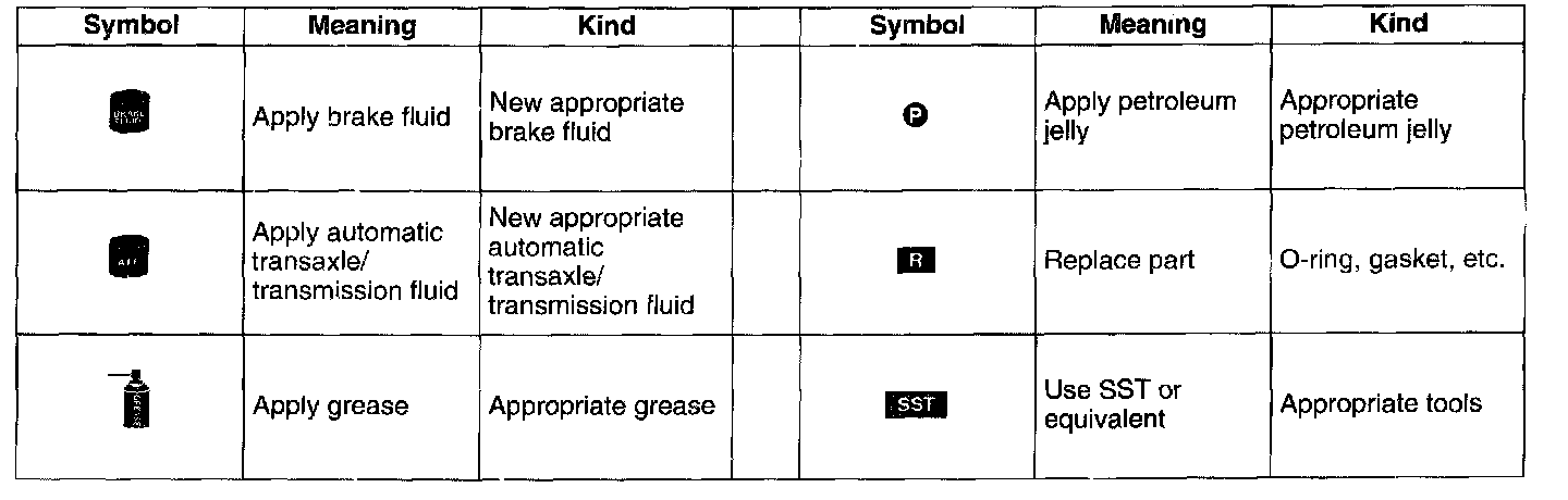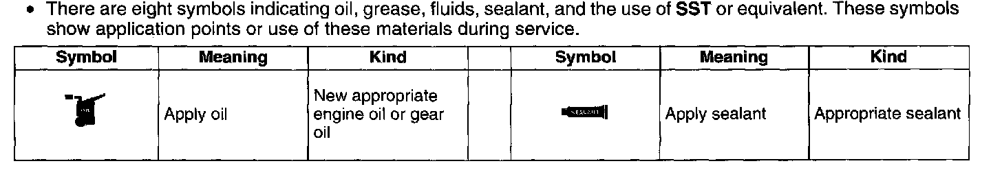 2. Expendable parts, tightening torques, and symbols for oil, grease, and sealant are shown in the overview illustration. In addition, symbols indicating parts requiring the use of special service tools or equivalent are also shown.