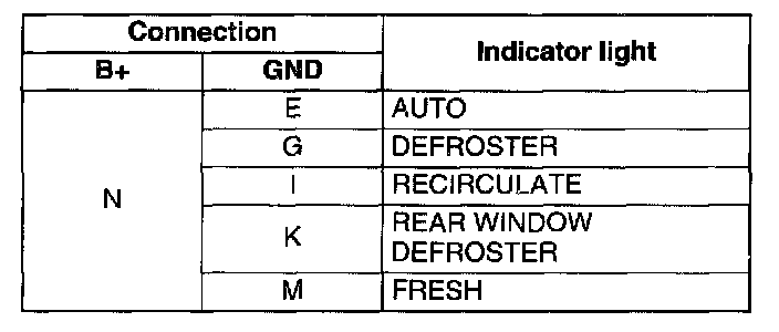 4. Apply battery positive voltage to terminal N and ground to terminals E, G, I, K, M and verify that the following indicators turn on.