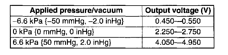 5. Decrease the applied pressure from +6.6 kPa {+50 mmHg, +2.0 inHg} to -6.6 kPa {-50 mmHg, -2.0 inHg} and verify that the PCM terminal 3U voltage decreases accordingly.