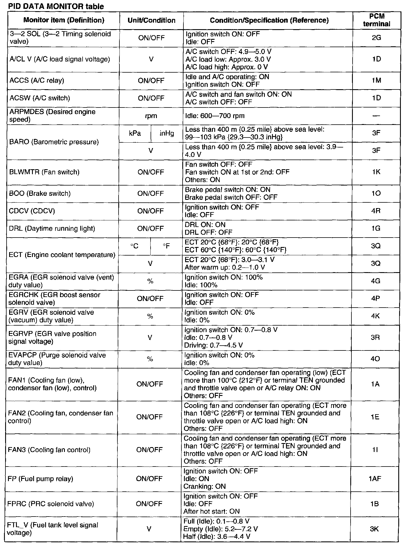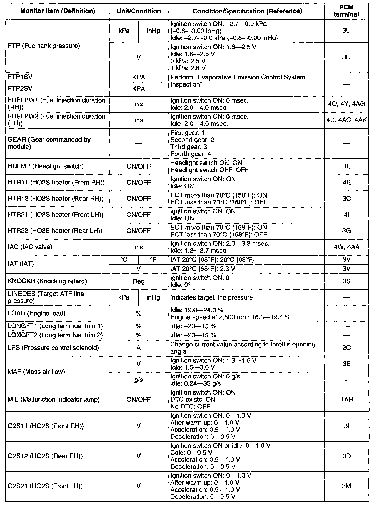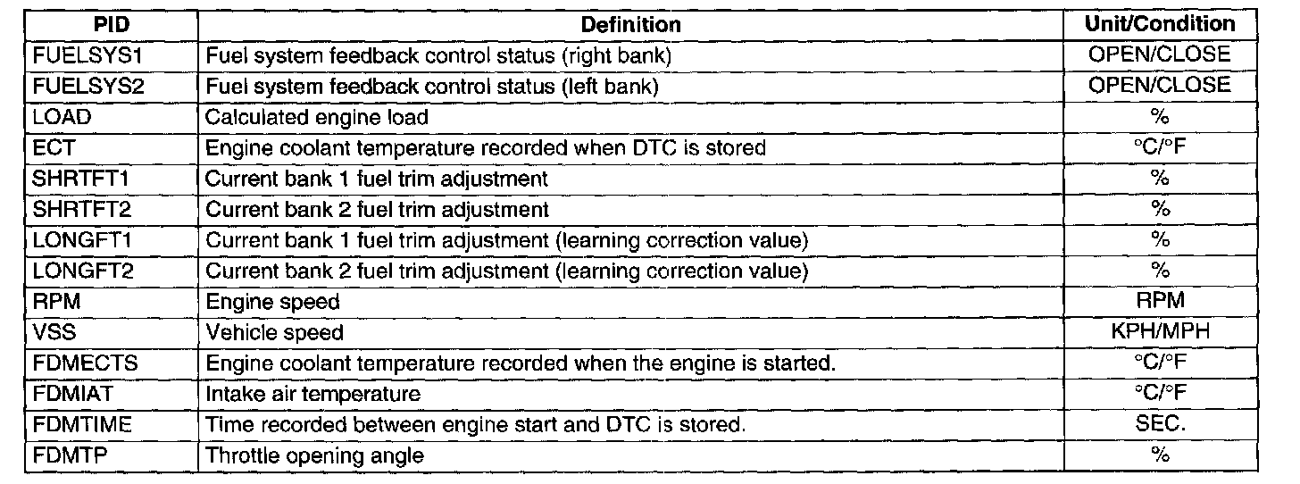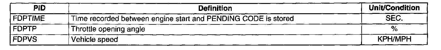 NOTE: FFD is a snapshot of the conditions that are present when DTC or PENDING CODE is stored. Once FFD is stored, this data will remain in PCM memory even if another emission related DTC or PENDING CODE is stored additionally, except for Misfire or Fuel System related DTC or PENDING CODE. Once Misfire or Fuel System related DTC or PENDING CODE is stored, it will overwrite any previous data and the FFD will not be further overwritten. When DTC associated with the FFD is erased or PCM is reset, new FFD can be stored.