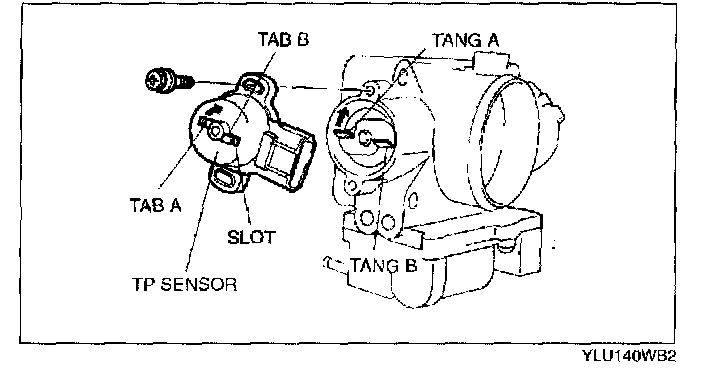 5. Open the throttle valve slightly and catch the tang of the throttle body on the TP sensor plastic tabs. Align tang A on the throttle body with tab A on the TP sensor. Make sure tangs on the throttle body mate with the tab on the TP sensor on the side of the tab without a slot.