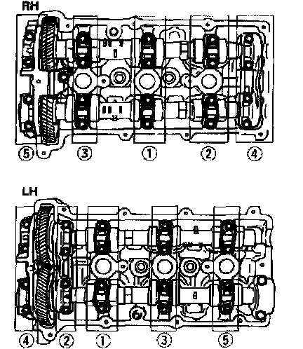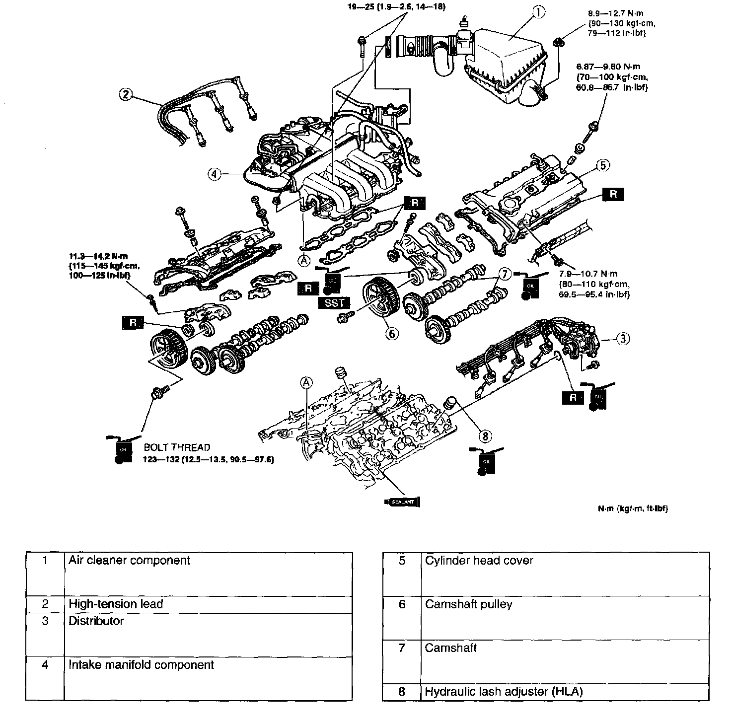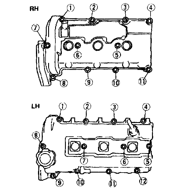 Cylinder head cover (5 to 6 steps in sequence, then retighten bolts RH No. 5 and 6, LH No. 6 and 7); 6.87 - 9.80 (60.8 - 86.7 in-lbf)