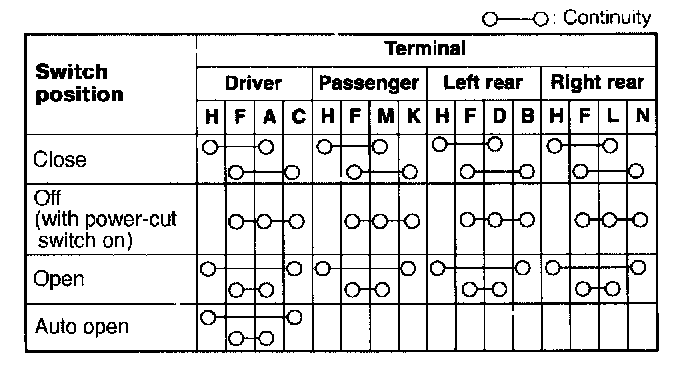 POWER WINDOW MAIN SWITCH INSPECTION1. Inspect for continuity between the terminals of the power window main switch connector with the main switch in the following positions.