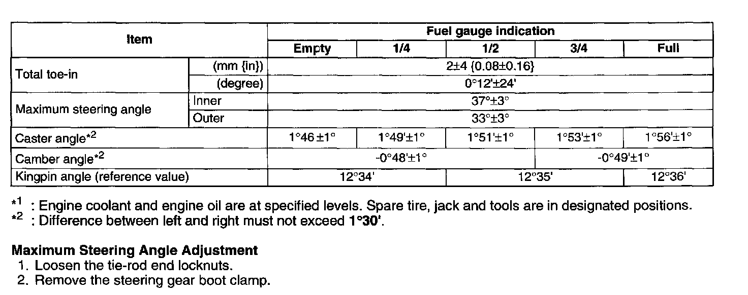 ^ Turning both tie rods one complete turn changes toe-in by about 6 mm (0.24 inch) (0°36').