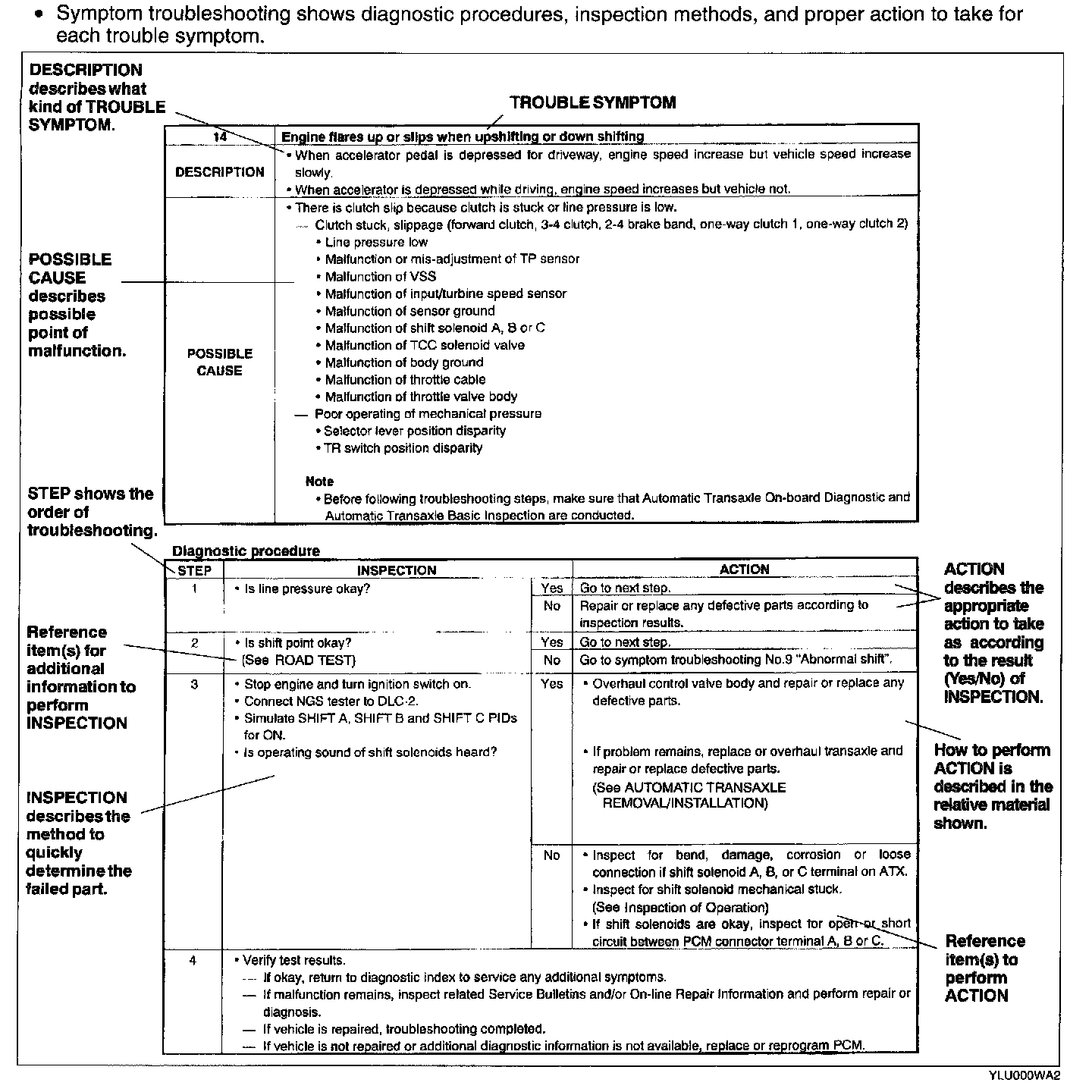 The quick diagnosis chart lists diagnosis and inspection procedures to be performed specifically relating to the cause of the malfunction.