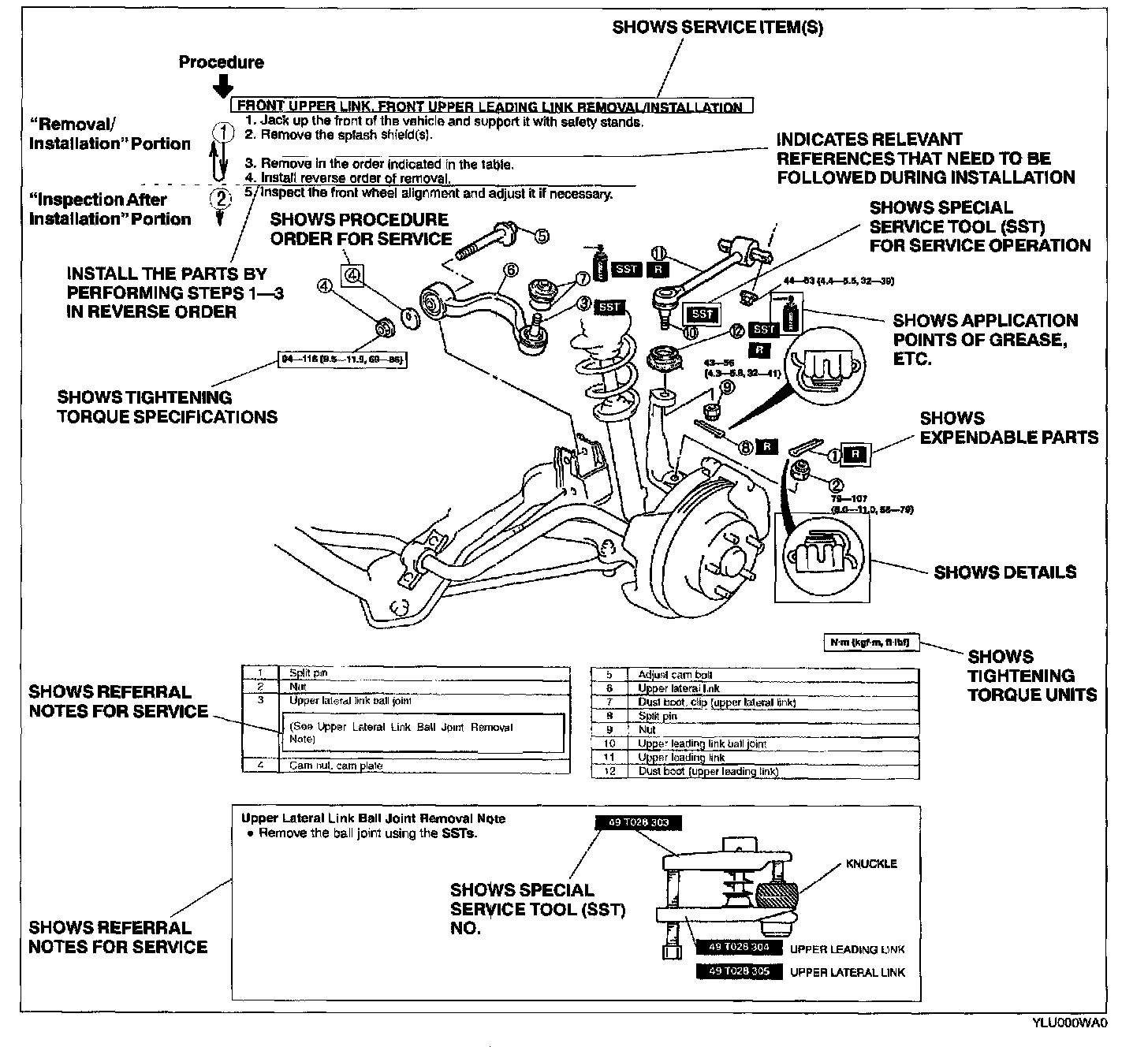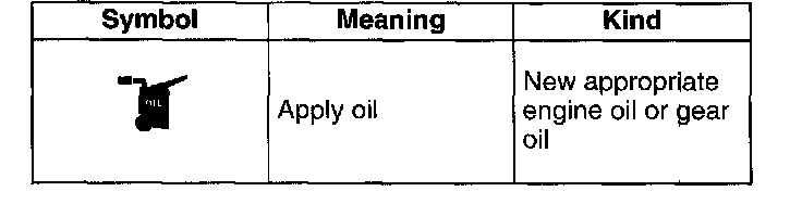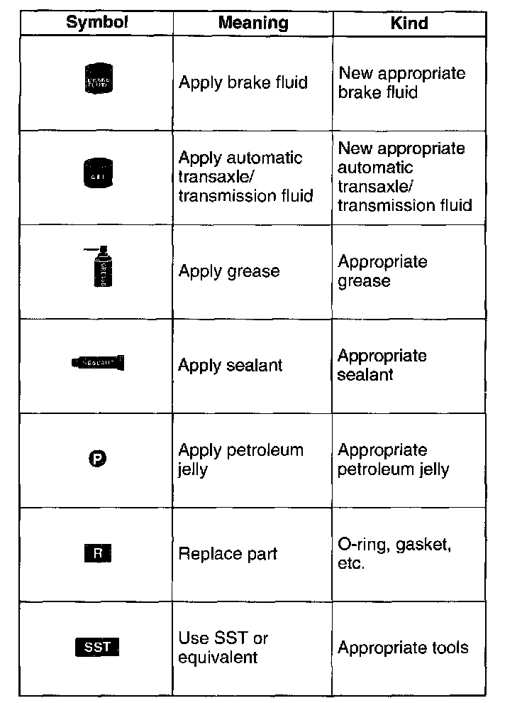 - There are eight symbols indicating oil, grease, fluids, sealant, and the use of SST or equivalent. These symbols show application points or use of these materials during service.