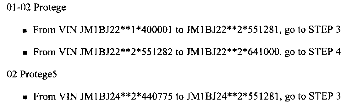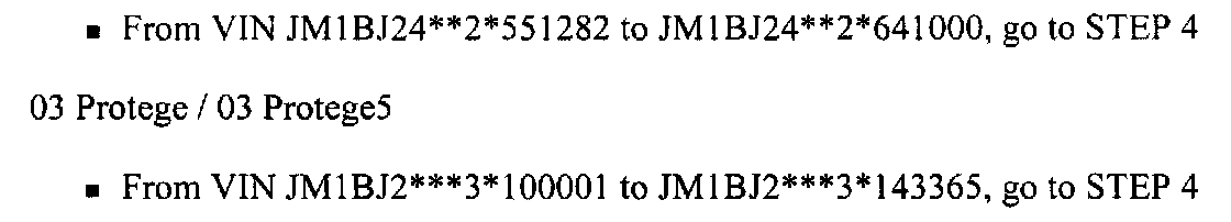 For 2003 Protege & Protege5 with VIN RANGE: JM1BJ2***3*l0000l to JM1BJ2***3*143365, proceed to 2003 Protege & Protege5 Reprogramming Instructions shown.