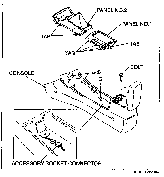 4. Remove the panel No.2 using a tape-wrapped screwdriver, disconnect the cigarette lighter connector, and remove the front ashtray illumination.