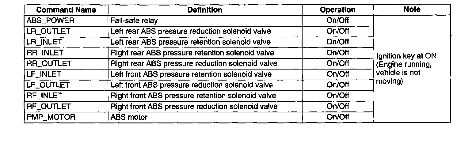 Active Command Modes ProcedureNote: When driving, the ABS motor and each valve automatically turn ABS_POWER on, and then each command on. ABS_POWER regulates the power supply for the ABS motor and 8 valves.