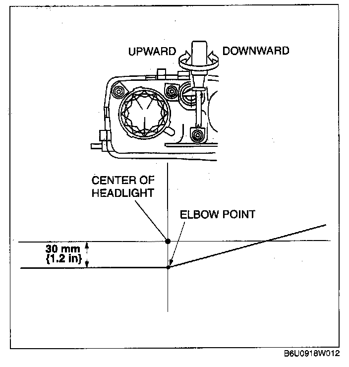 10. Turn the adjusting screws and adjust the headlight so that the elbow point is in the shaded area in the figure.