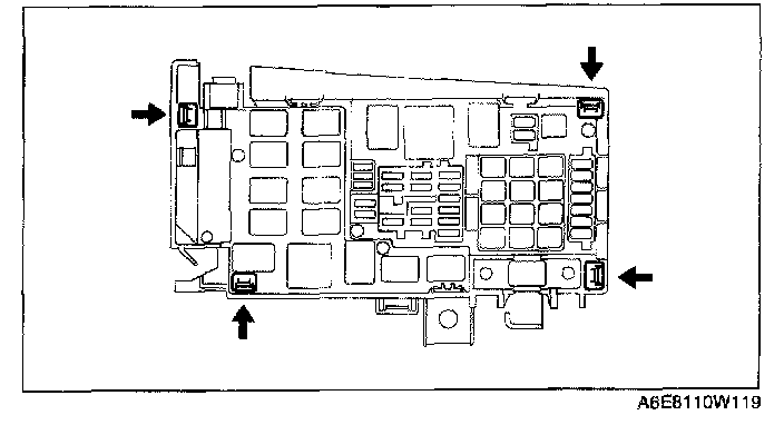 1. Press and remove the tabs on the main fuse block at the positions indicated by the arrows.