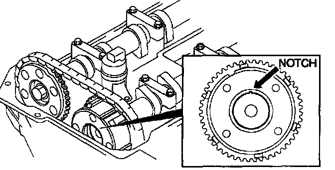 ^ If the groove and the notch are not aligned, turn the crankshaft clockwise two rotations.Verify that the groove and the notch are If the groove and notch are still not aligned, replace the variable valve timing actuator.