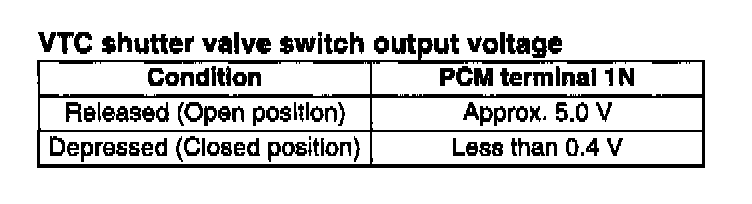 2. Verify that the PCM terminal 1N voltage is as shown in the given table when the VTC shutter valve actuator rod is depressed and released by hand.