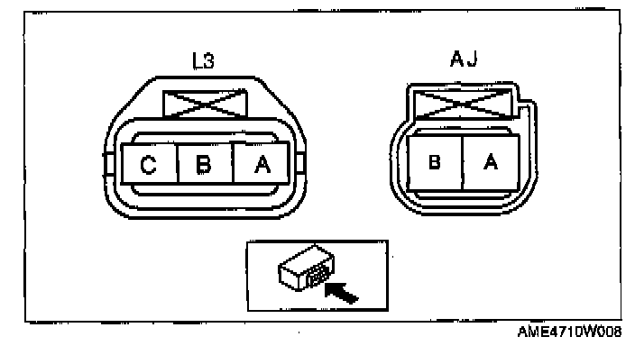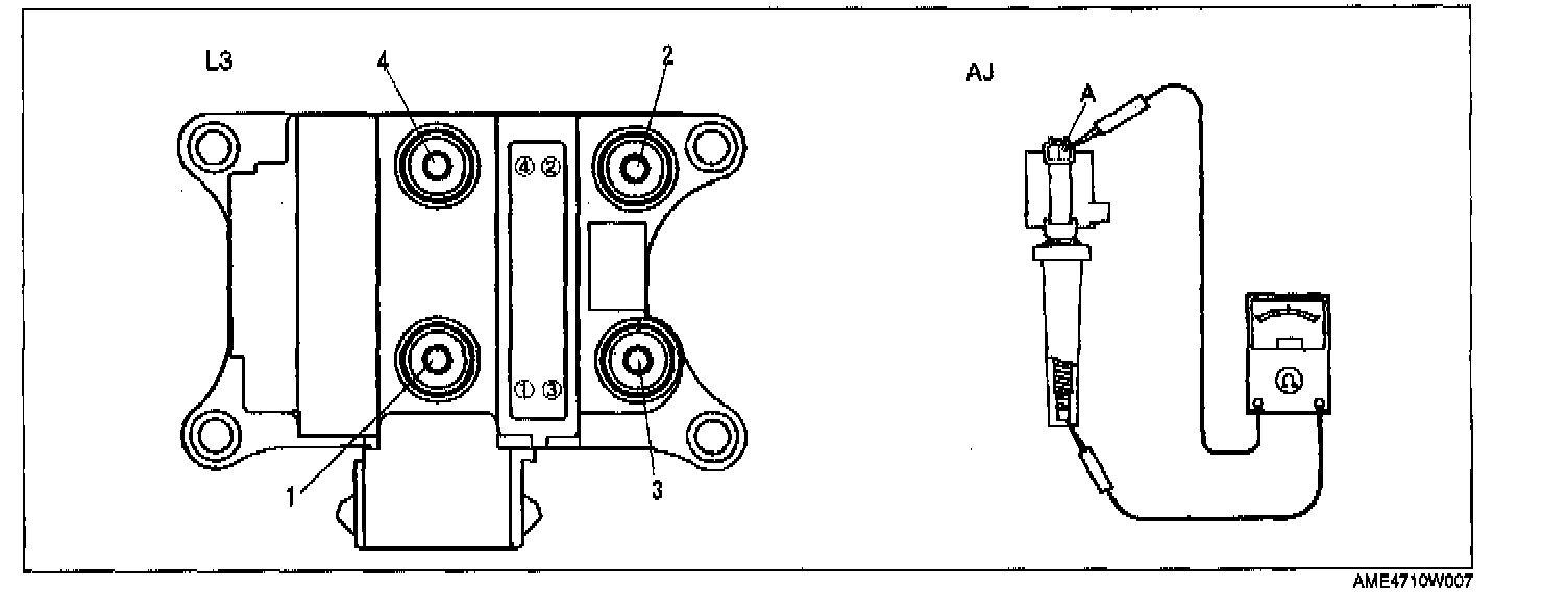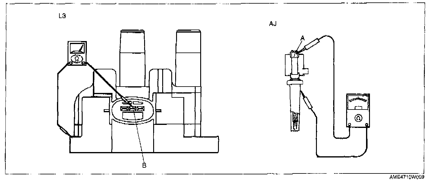3. Measure the insulation resistance from terminal B (L3 engine model), terminal A (AJ engine model) to ignition coil case using an ohmmeter.