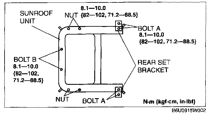 6. Remove bolts B and nuts, and then remove the sunroof unit.