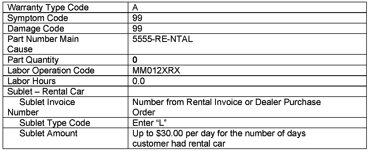 A rental car may be provided to the customer if eligible based on the terms and conditions of the Rental Car Reimbursement Program policy 12.0. Rental car reimbursements are available only on 2001 and newer vehicles within the mileage and time limitations under the New Vehicle Limited Warranty. If the customer was placed in a rental car while the campaign was being completed submit a separate claim/problem using the standard rental claim information.