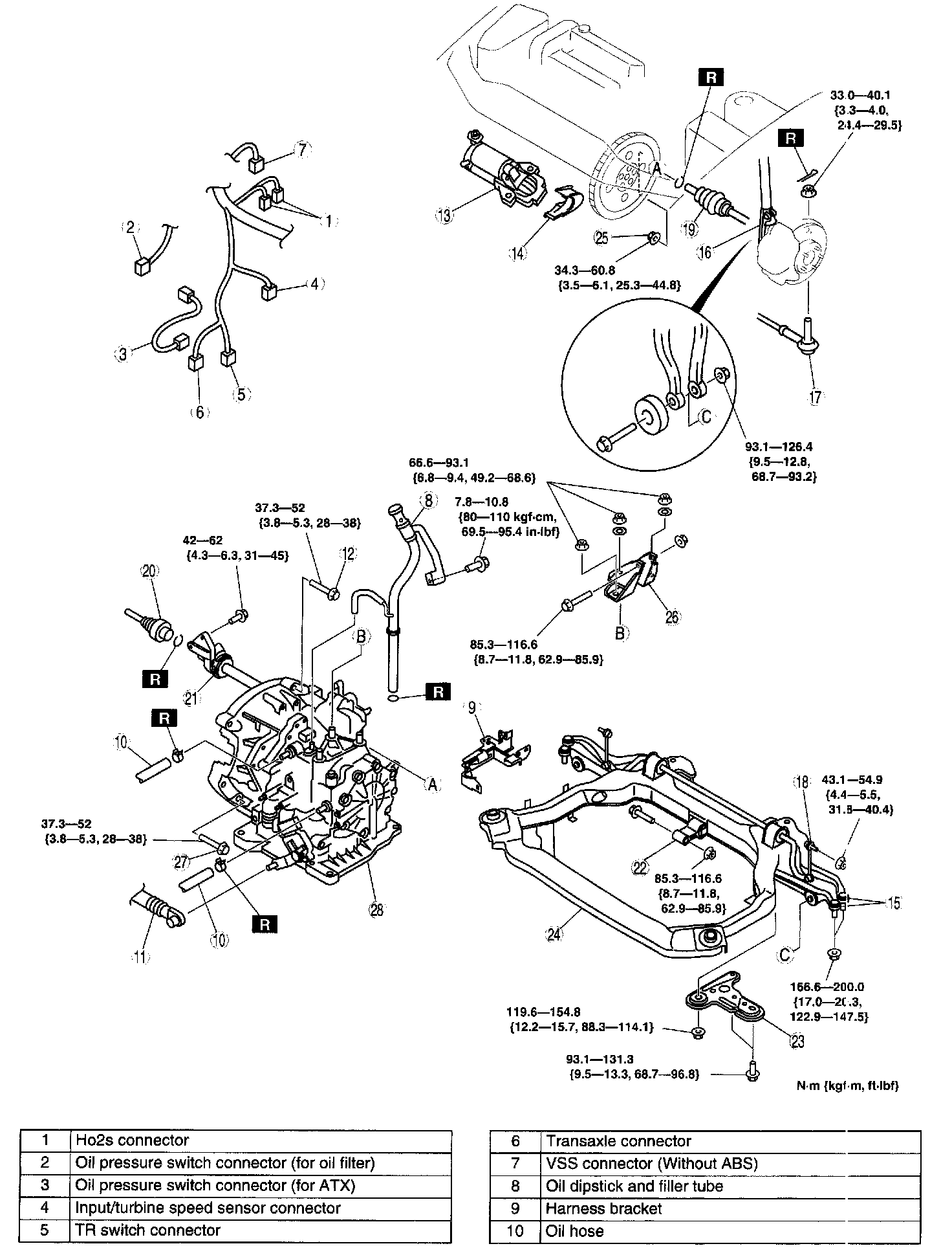 A, B, C: 66.6 - 93.1 Nm (6.8 - 9.4 kgf-cm, 49.2 - 68.6 ft. lbs.)