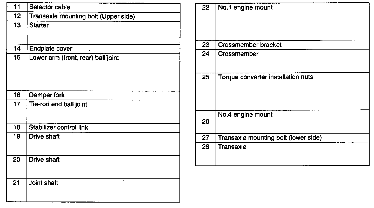 ^ To prevent the torque converter and transaxle from separating, remove the transaxle without tilting it toward the torque converter.