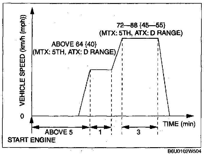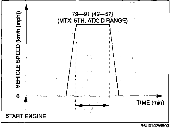 6. Drive the vehicle at the engine speed of 65 - 80 km/h {40 - 50 mph} for 5 min or more.
