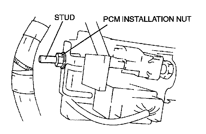 d. While pushing the harness, push the stay until it comes apart from the stud with the PCM installation nut.