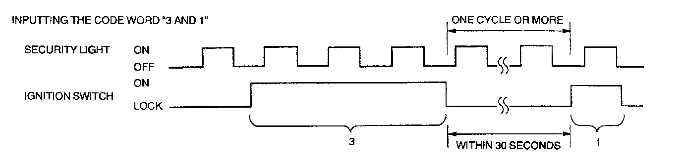 d. Wait at least one illumination cycle and within 30 seconds of going to LOCK position, turn ignition switch to ON position while security light is off and count one illumination cycle. As the light goes out after the first illumination, turn key to LOCK position.