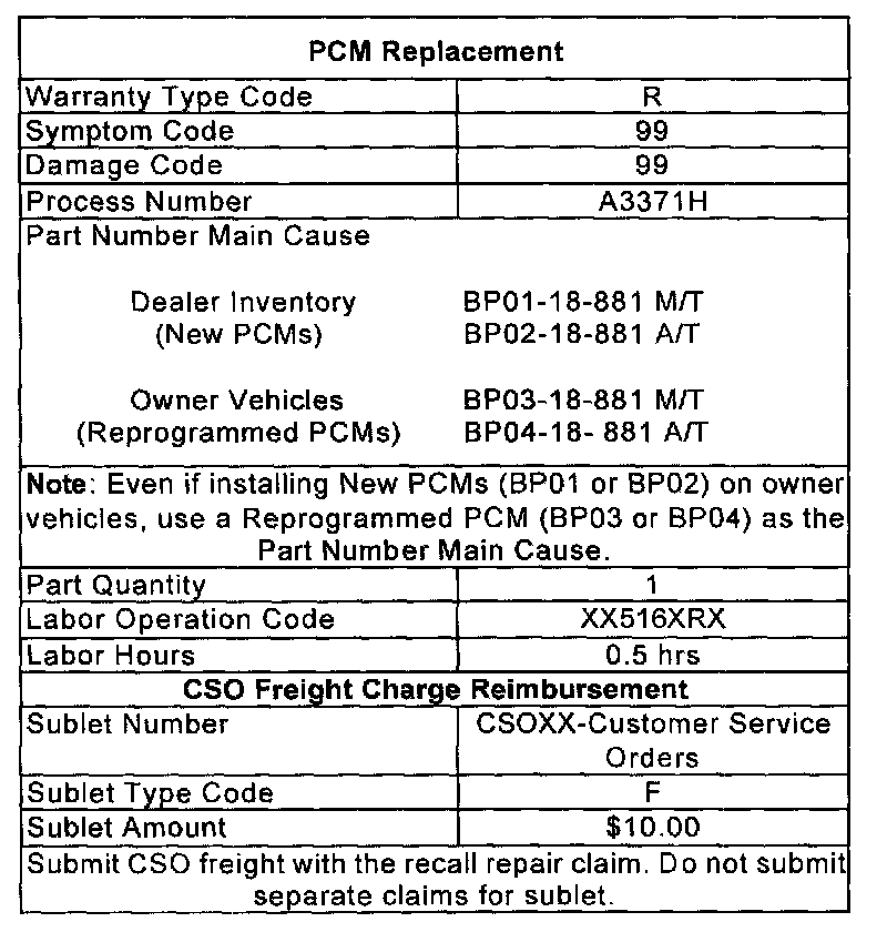 Beginning July 28, dealers will automatically receive PCMs as a CSO order. The quantity is based on vehicle retail sales. Dealers with low Miata retail sales may not receive a shipment. CSO Freight charges will be reimbursed as a sublet on warranty claims. Except for the automatic pre-shipment, extra PCMs for dealer stock will not be available. To order an additional PCM for this recall, fax one form (PCM Order for Owner Campaign) for each PCM requested to MNAO Technical Services. Mazda will ship additional PCMs as CSO orders, and freight will be reimbursed as a sublet on warranty claims.