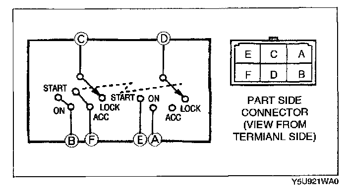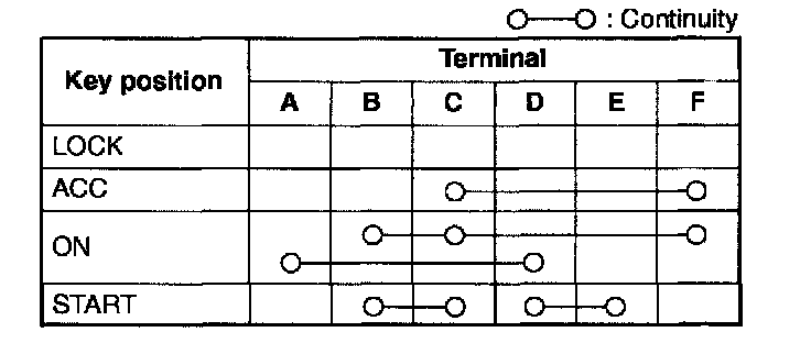 3. Inspect for continuity between the ignition switch terminals using an ohmmeter.