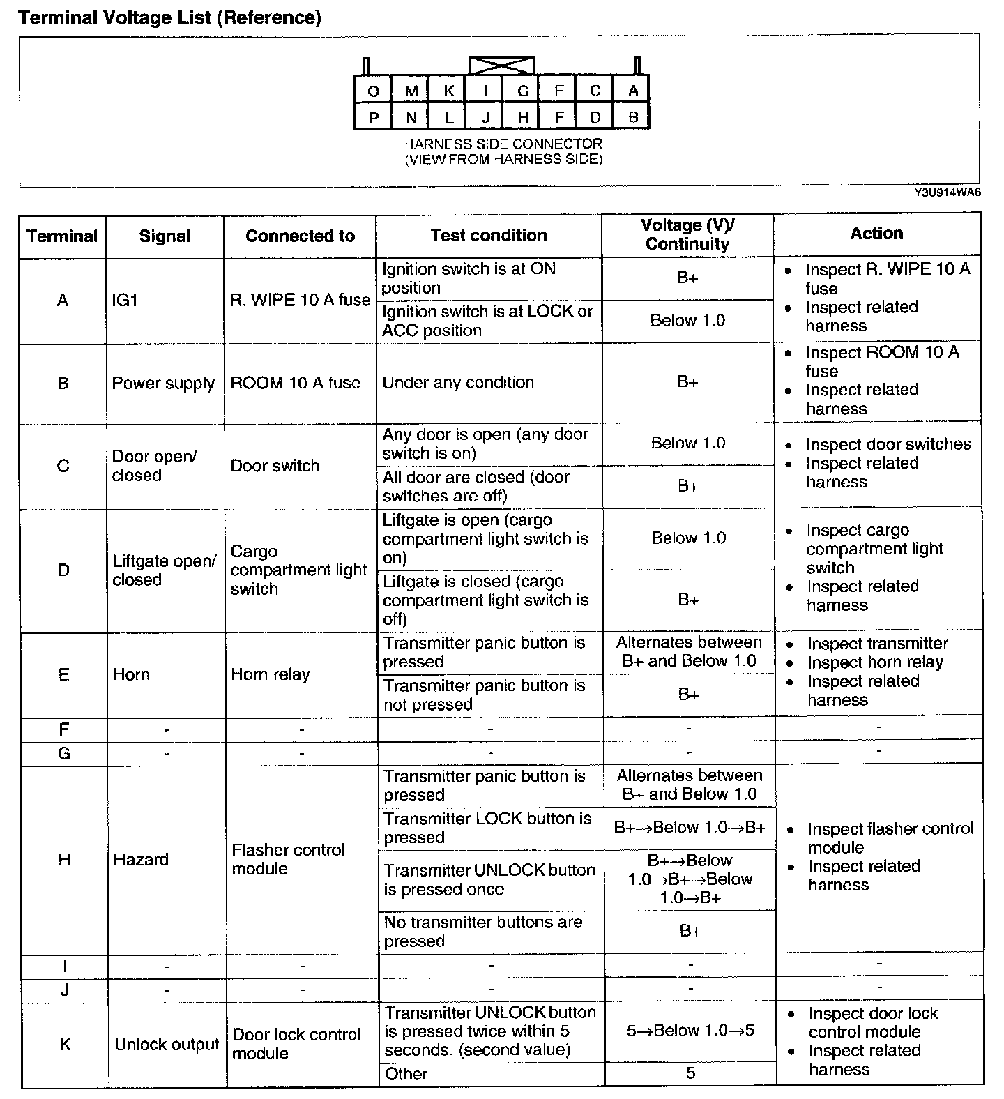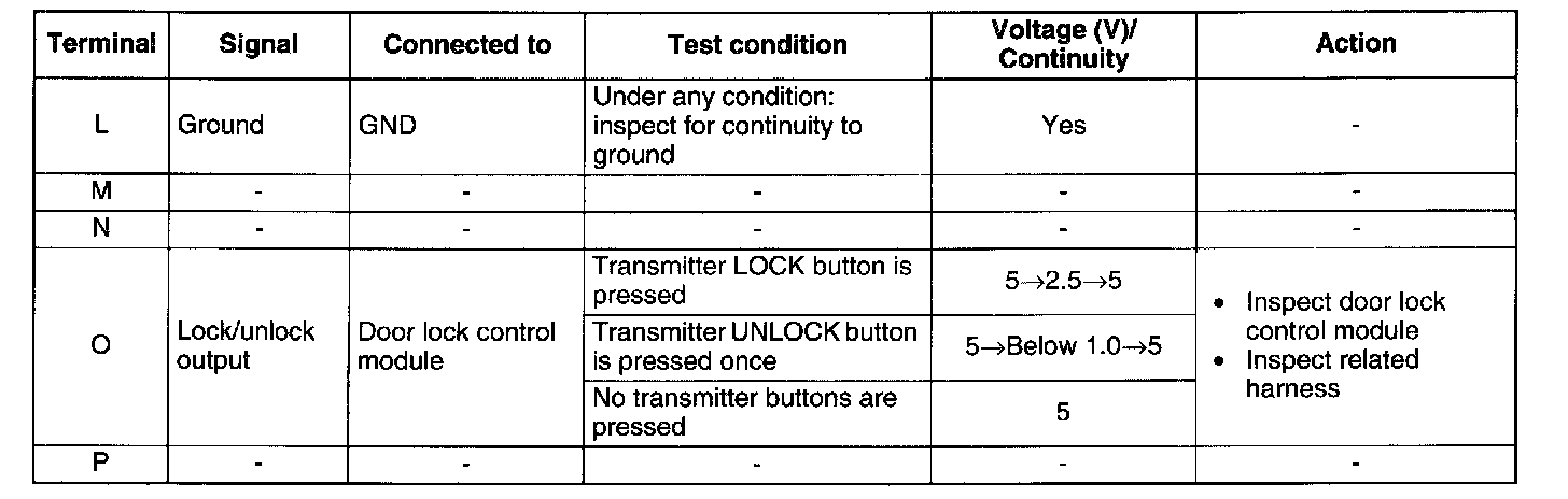 2. Measure the voltage at the keyless control module terminals (other than terminal L) as indicated.
