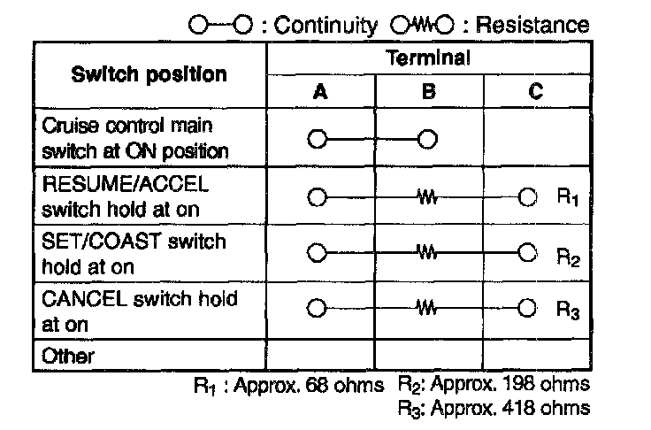 4. Measure the resistance and inspect for continuity between the cruise control switch terminals using an ohmmeter.