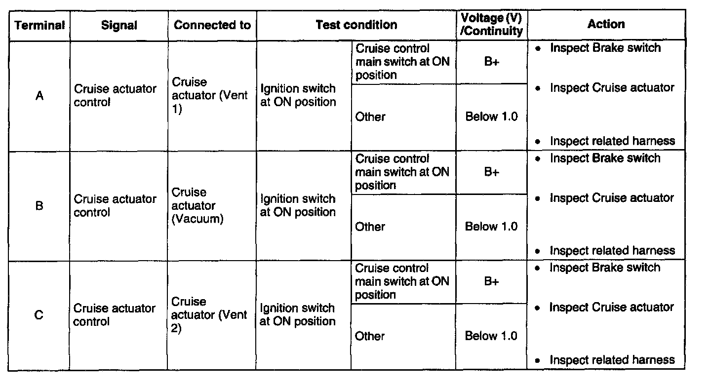 3. Measure the voltage at the cruise control module terminals as indicated.