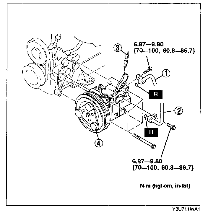 6. Remove in the order indicated below. Do not allow compressor oil to spill.
