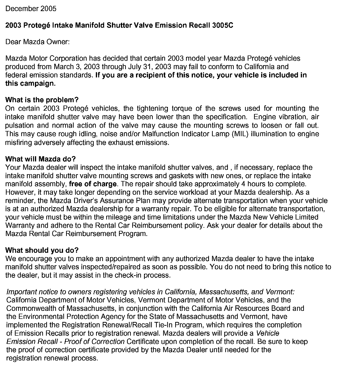 Recall - Intake Manifold Shutter/Variable Tumble Valves