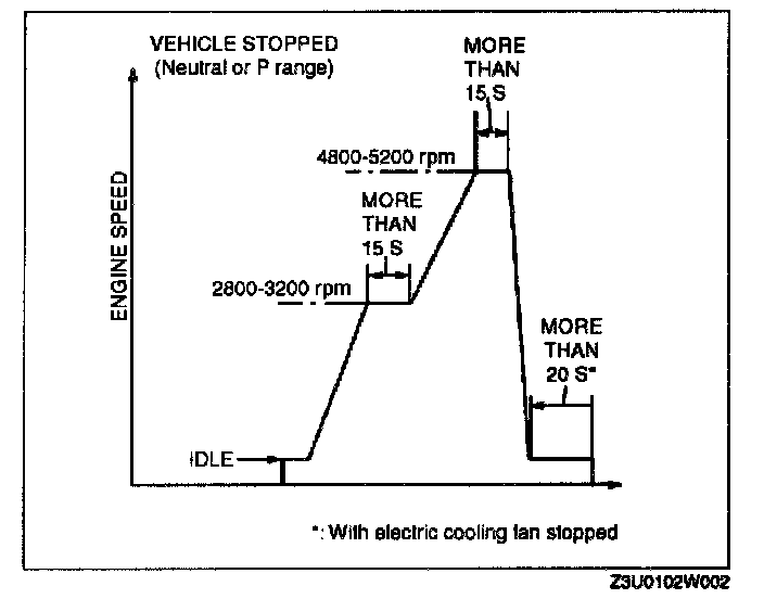 3. Perform no load racing at the engine speed shown in the graph, then idle the engine for more than 20 seconds after the cooling fan stopped. If possible, monitor RPM PID for engine speed and cooling fan status during this procedure.
