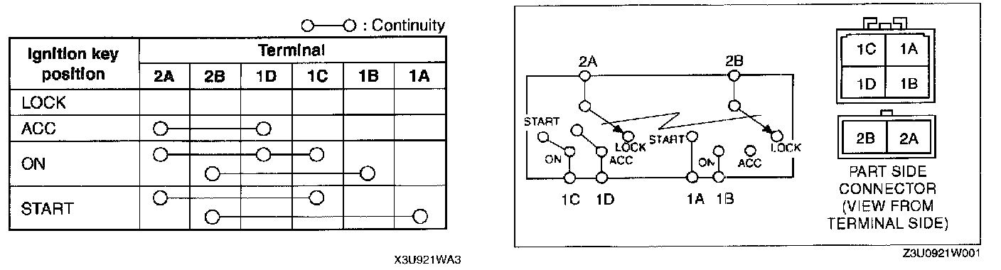 4. Inspect for continuity between the ignition switch terminals using an ohmmeter.