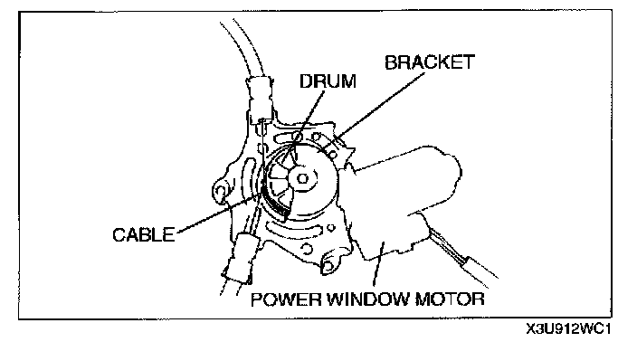 1. Hold the drum and the cable with the bracket to prevent them from being pulled out with the power window motor.