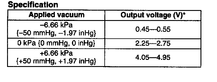 6. Decrease the applied pressure from +6.66 kPa {+50 mmHg, +1.97 inHg} to -6.66 kPa {-50 mmHg, -1.97 inHg} and verify that the PCM terminal 62 voltage decreases accordingly as specified.