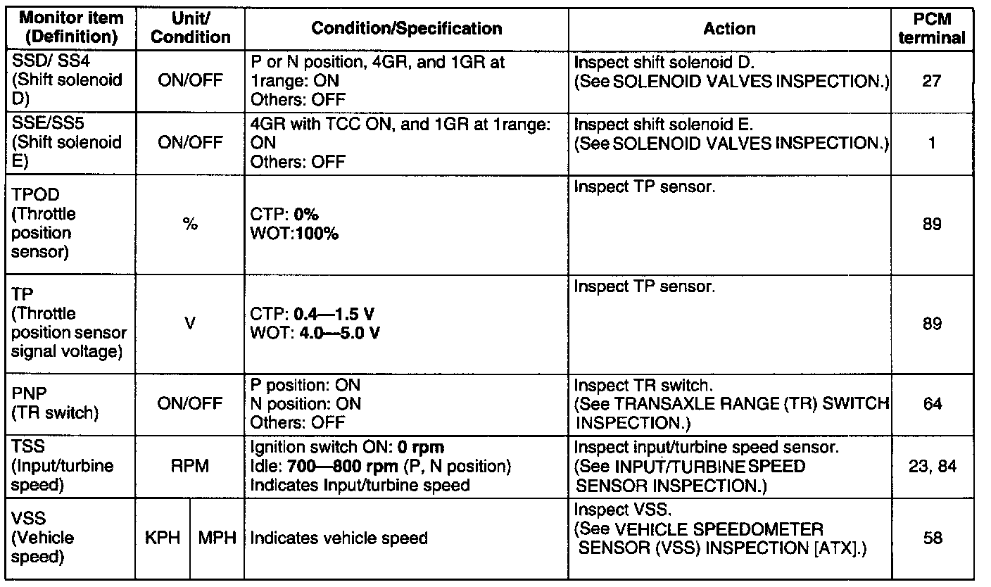 ^ The PID/DATA MONITOR function monitors the calculated value of the input/output signals in the PCM. Therefore, if a monitored value of an output device is out of specification, it is necessary to inspect the monitored value of the input device related to the output device control. Since an output device malfunction is not directly indicated as a malfunction of the monitored value for the output device, it is necessary to inspect the output device individually using the simulation function, etc.