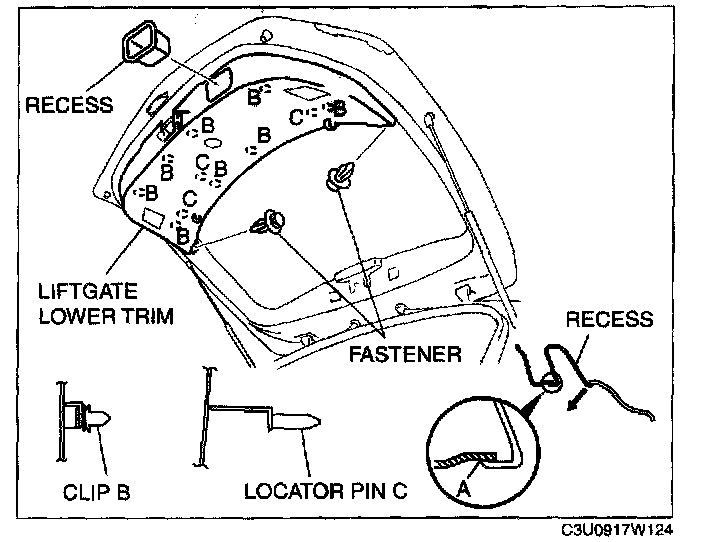 5. Pull the liftgate lower trim outward, then detach clips B and locator pins C from the liftgate.