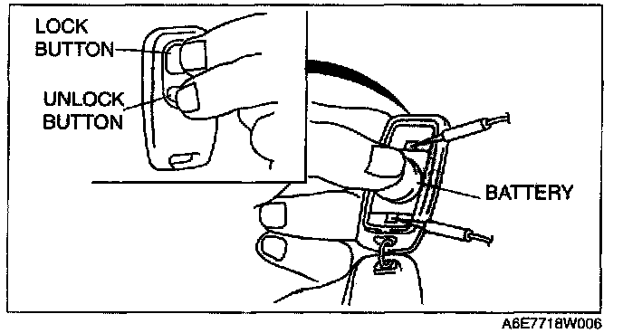 3. While pressing the battery as shown in the figure, press the LOCK and UNLOCK buttons on the transmitter at the same time to start measurement of the voltage.