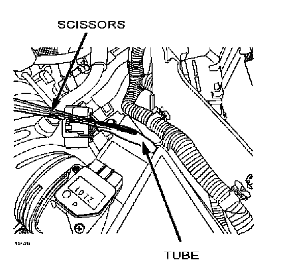 6. Identify and carefully cut Black, protective tube of airflow sensor harness using scissors.