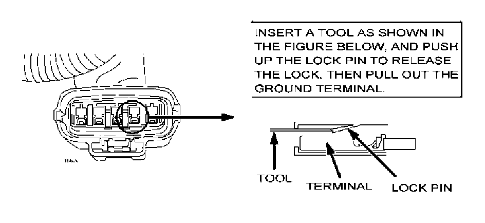 15. Insert modified ground wire terminal into airflow connector until a click it heard, indicating the terminal lock has engaged. Verify that terminal is secure in connector by giving a slight pull.