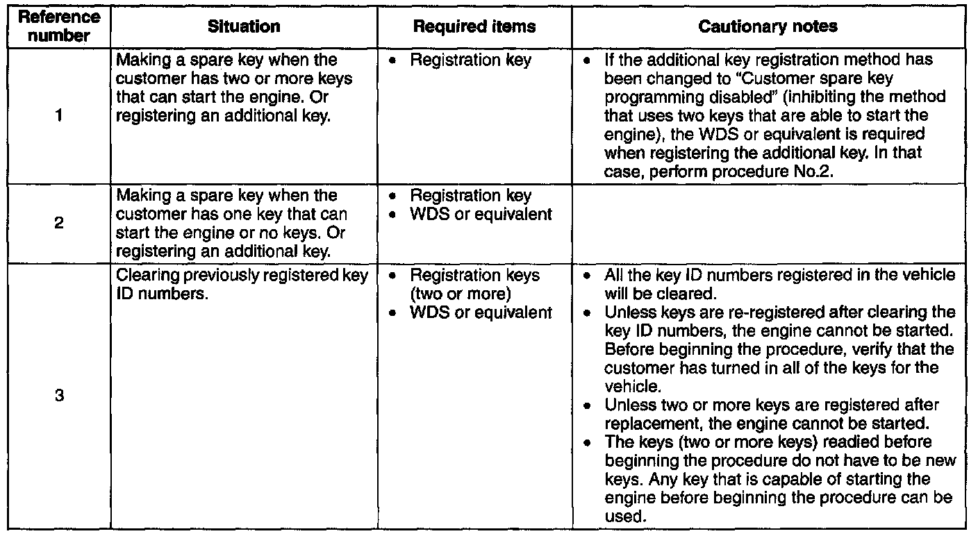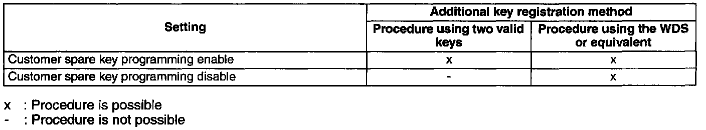 - By disabling the "No.1 Additional Key Registration Procedure (Using Two Valid Keys)", only the WDS or equivalent can be used to register additional keys, thereby preventing two valid keys from being used to create an unauthorized spare key. This function is for use by rental car or other companies with vehicle fleets.