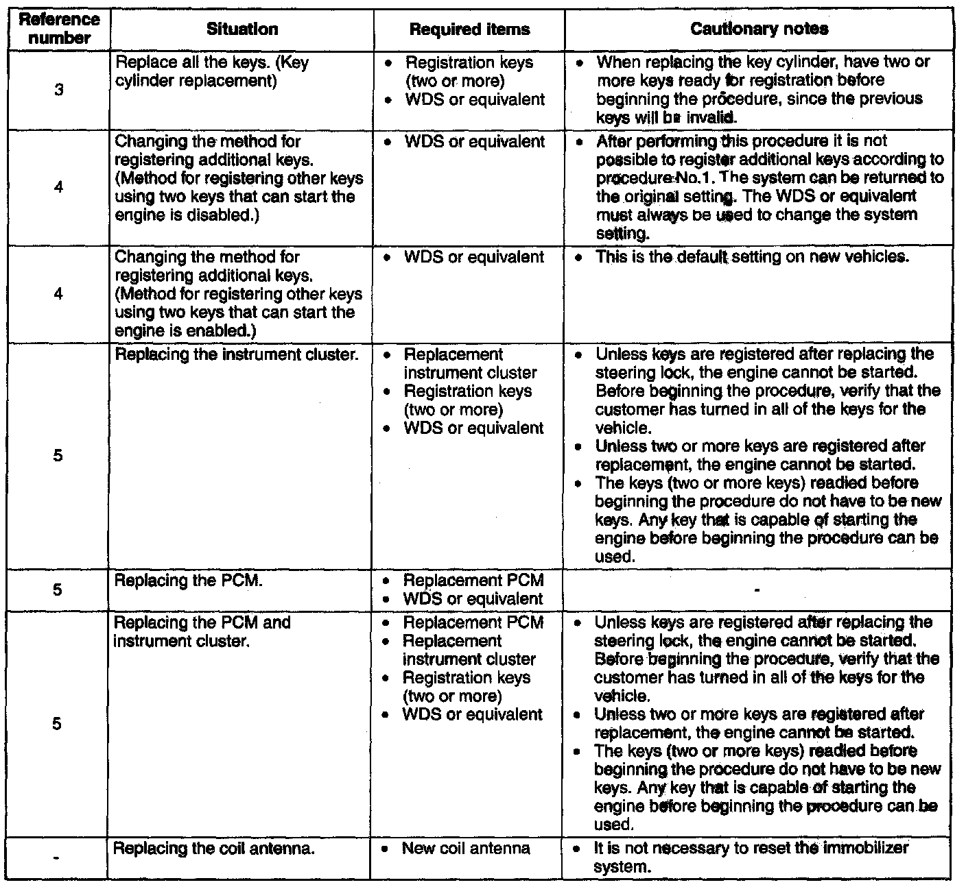 - When performing the following procedures, the immobilizer resetting procedure using the WDS or equivalent must also always be performed: "instrument cluster replacement", "PCM replacement", "instrument cluster and PCM joint replacement", "Key ID number clearing". The engine will not start unless all work is performed using the WDS or equivalent.