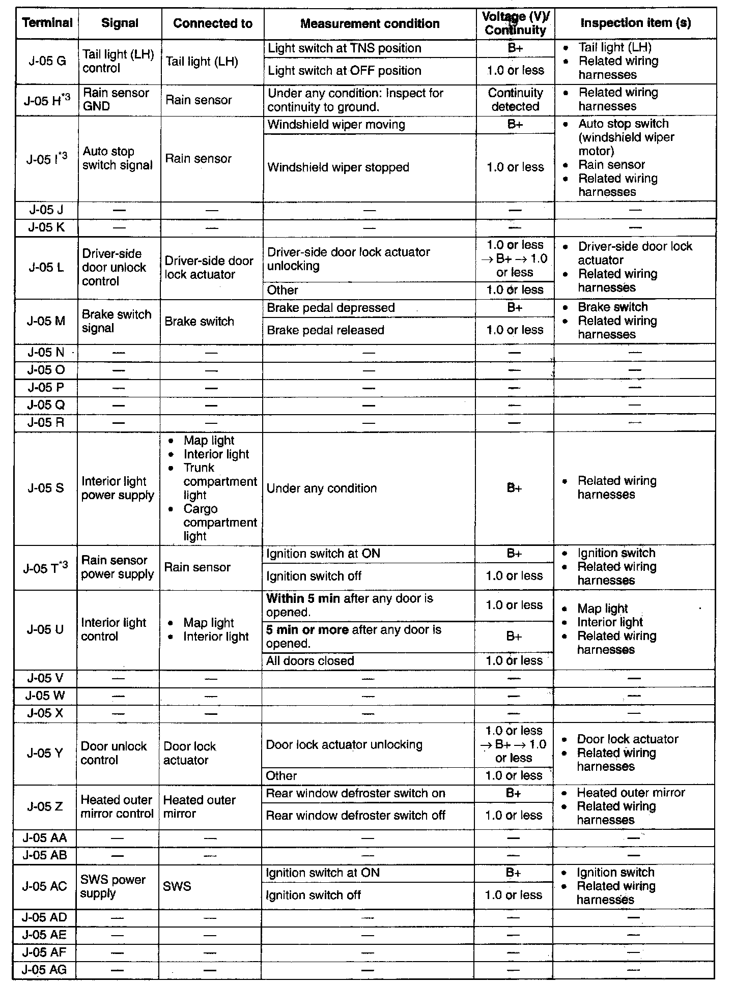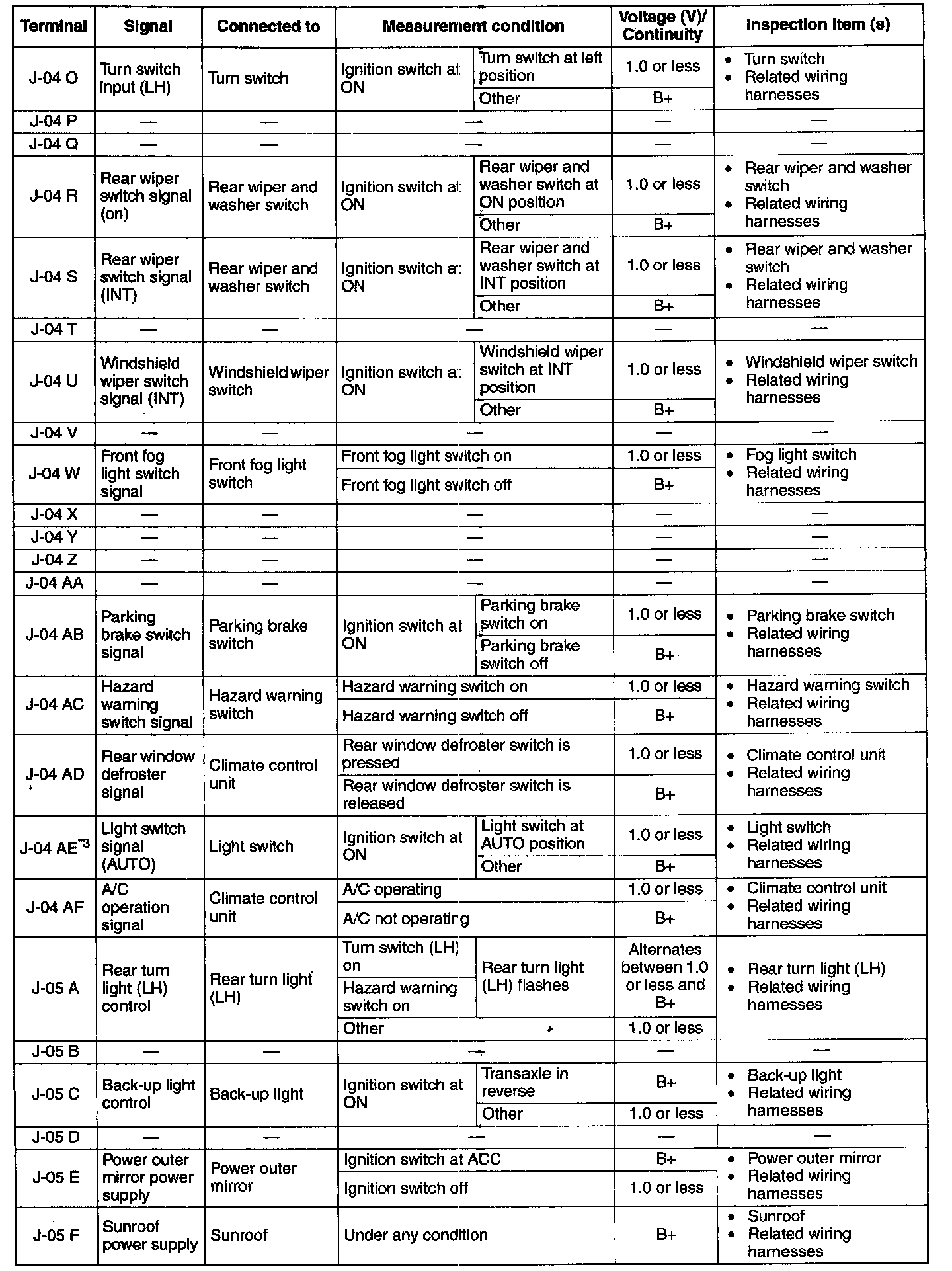 - If the voltage or continuity is not as specified in the Terminal Voltage Table (Reference), inspect the parts under "Inspection item (s)".