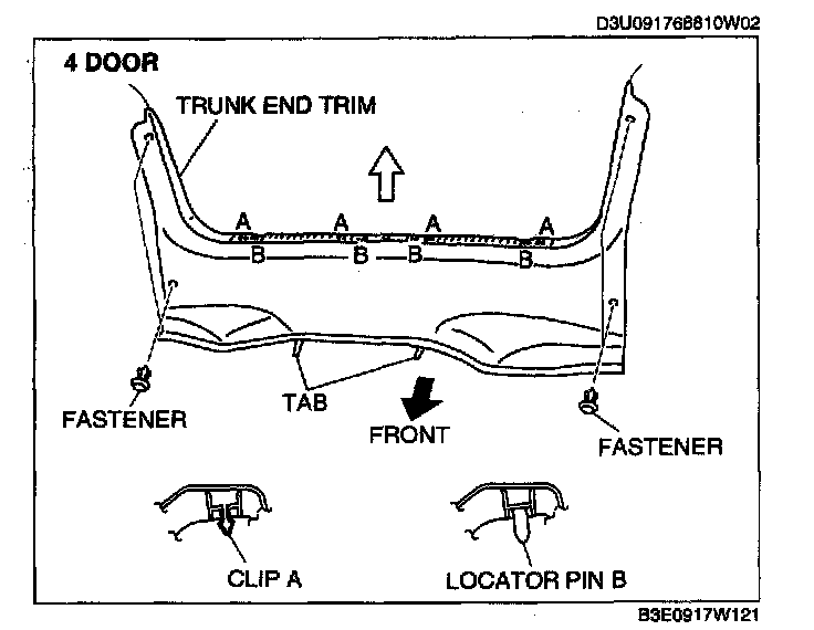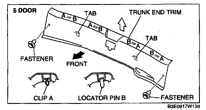 Pull the trunk end trim upward, then detach clips A, locator pins B and tabs.